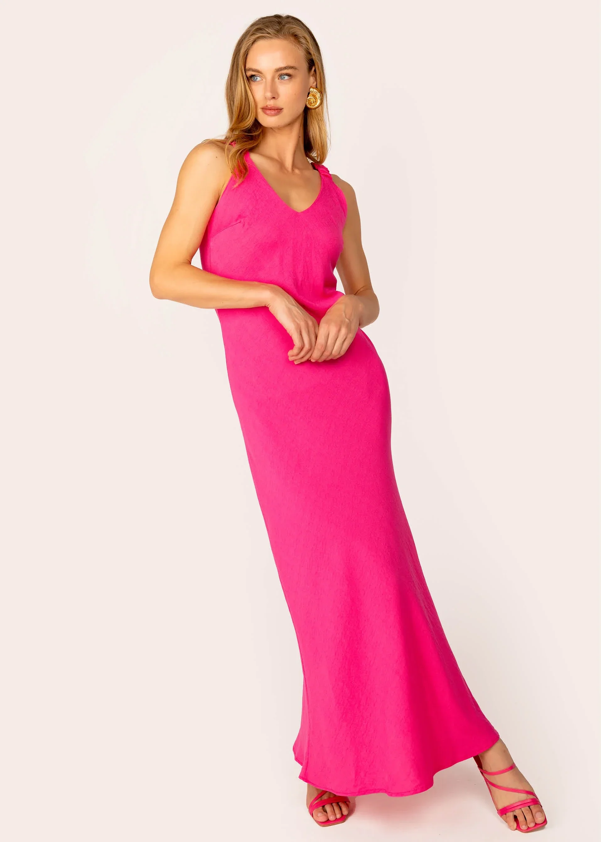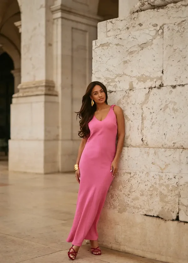 - Roze mouwloze maxi jurk met aansluitende pasvorm.