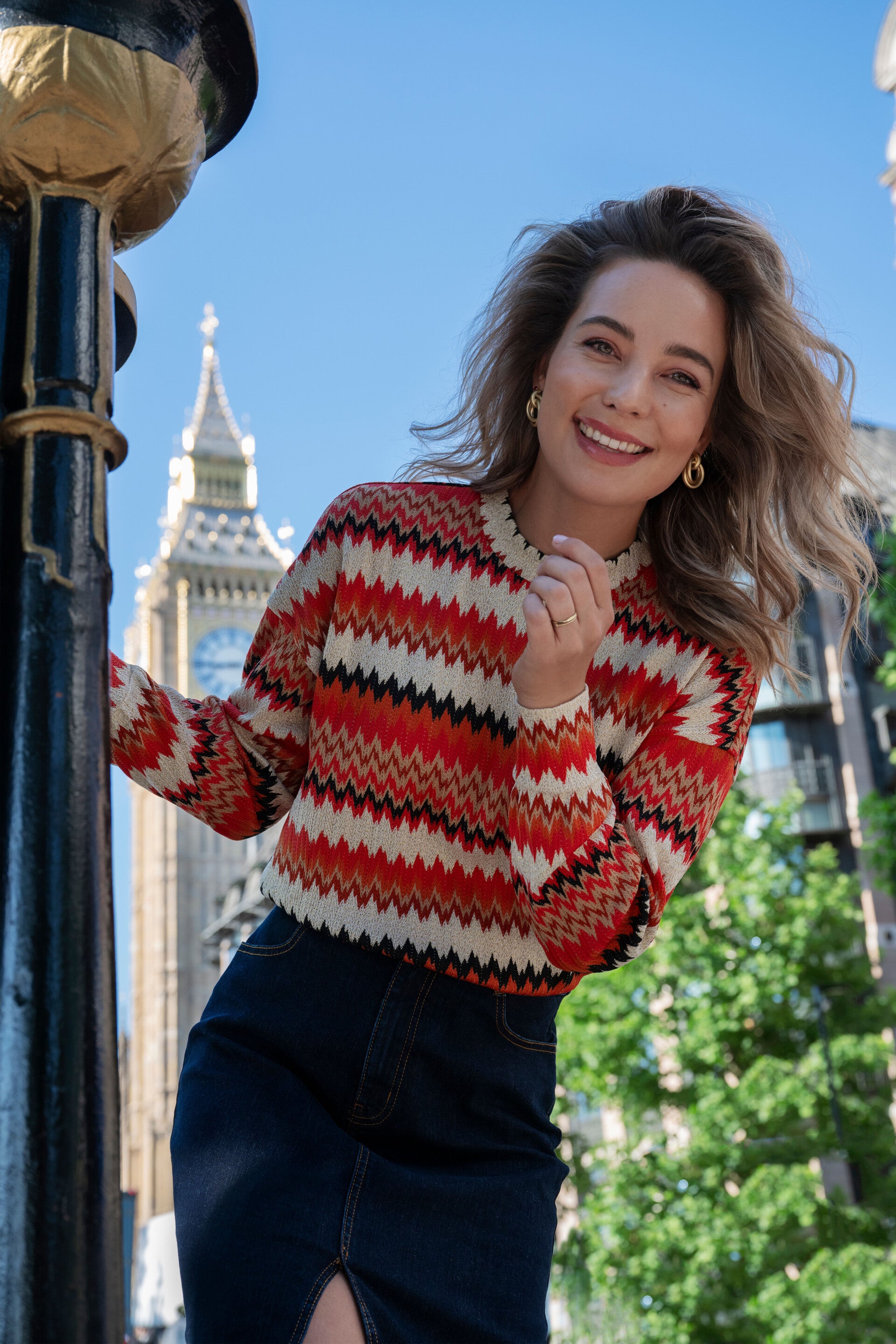 Deze opvallende en stijlvolle trui heeft een levendig zigzagpatroon, waarbij warme tinten rood, oranje en zwart worden gecombineerd met subtiele crème accenten. Het ontwerp doet denken aan klassieke retrostijlen, wat een gedurfde maar tijdloze touch aan je garderobe toevoegt.