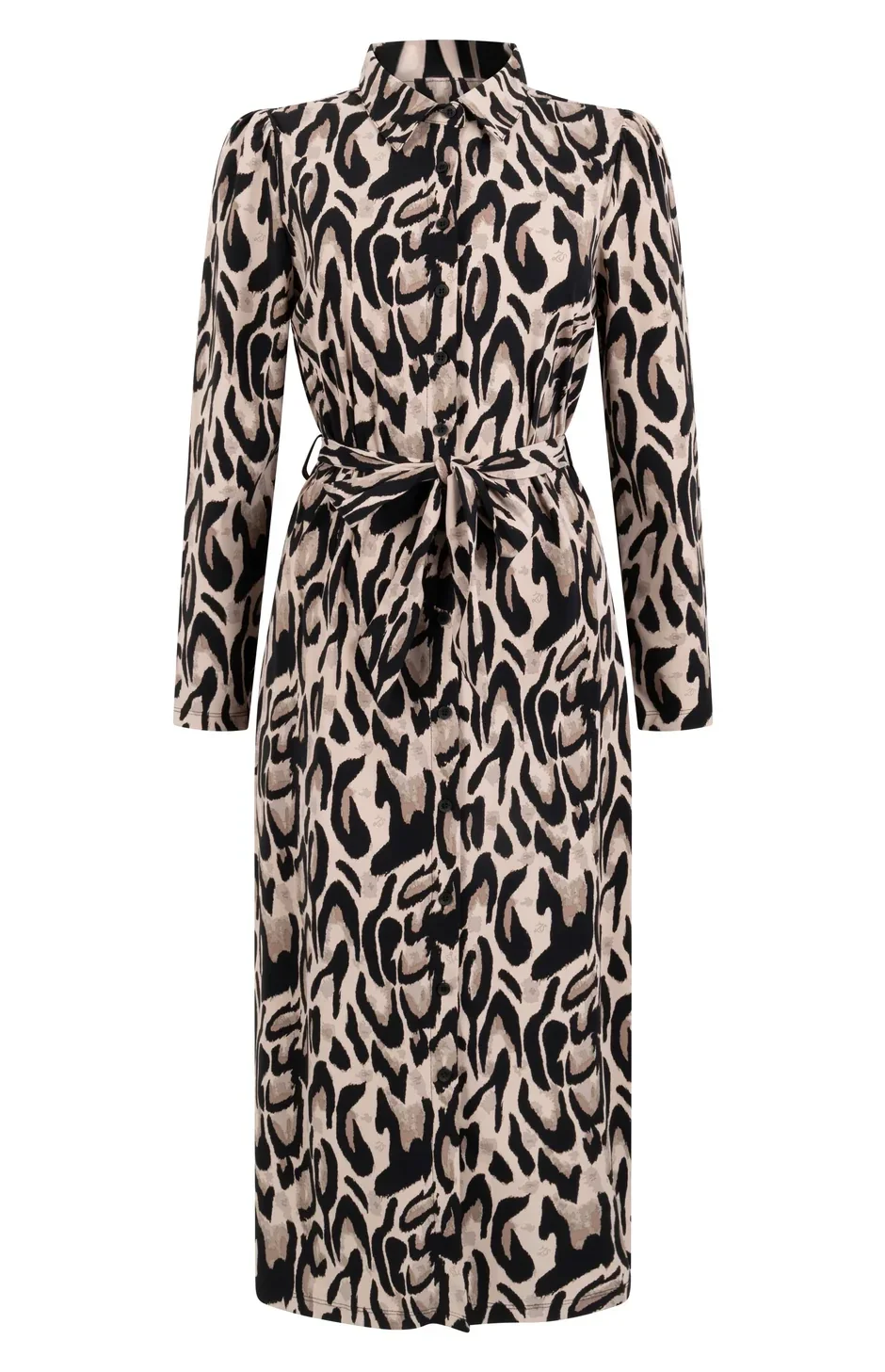 De Zoso Travel Jurk Jose Greige Black 245 is een stijlvolle lange jurk met een opvallend luipaardmotief in de kleuren greige en zwart. Deze jurk is ontworpen met een klassieke kraag en een knoopsluiting aan de voorkant, wat zorgt voor een tijdloze en elegante uitstraling.