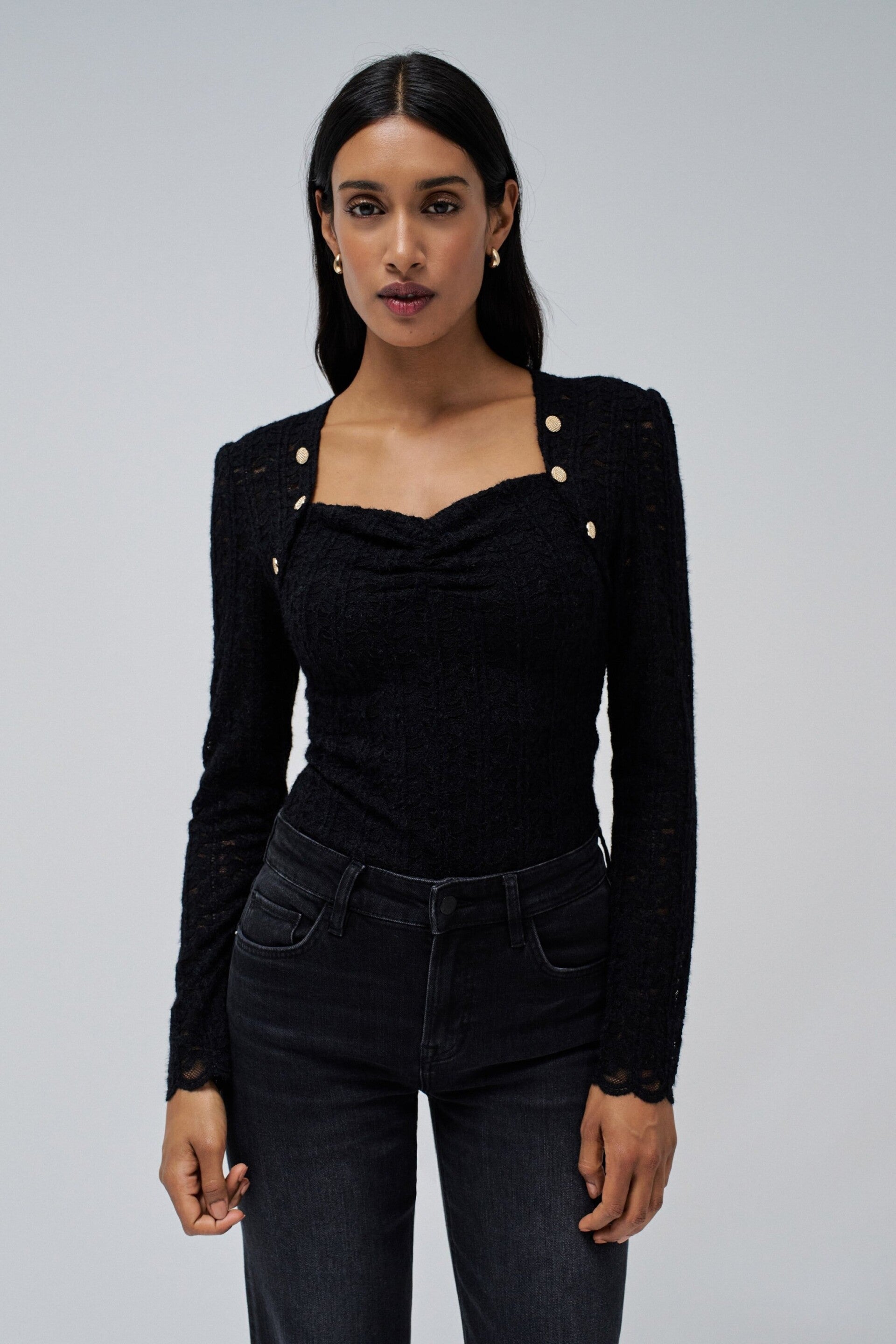 Enhance your style with this black long-sleeved sweater, with a slim fit that flatters the silhouette. The square neckline with gathering adds a touch of elegance, while the detail of metallic buttons adds a sophisticated note. Perfect for a versatile and modern look for any occasion.