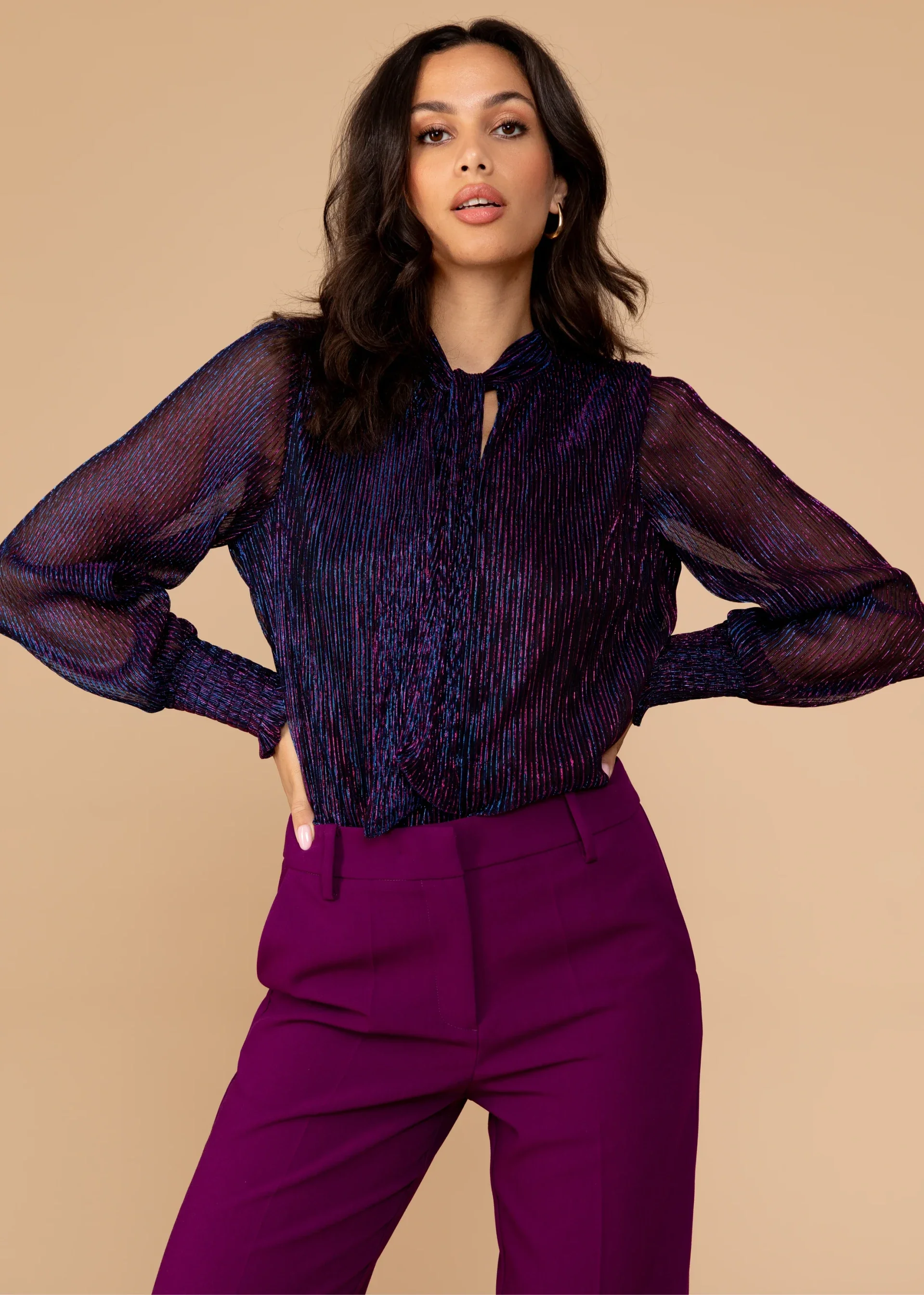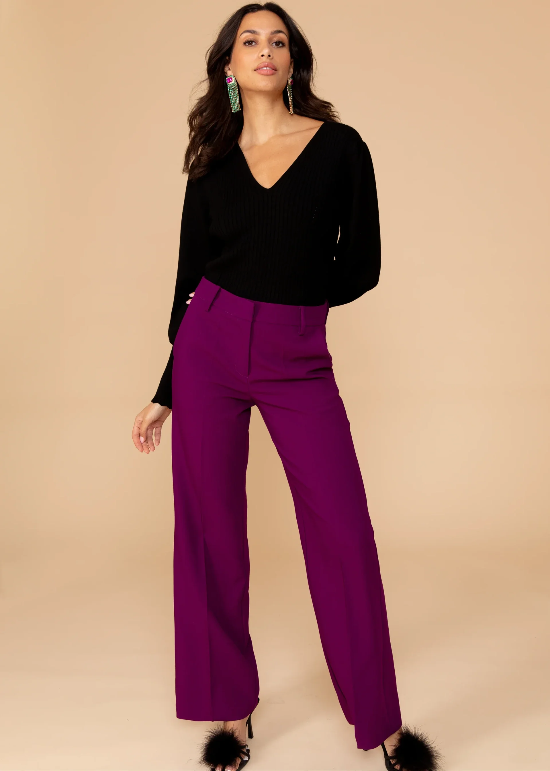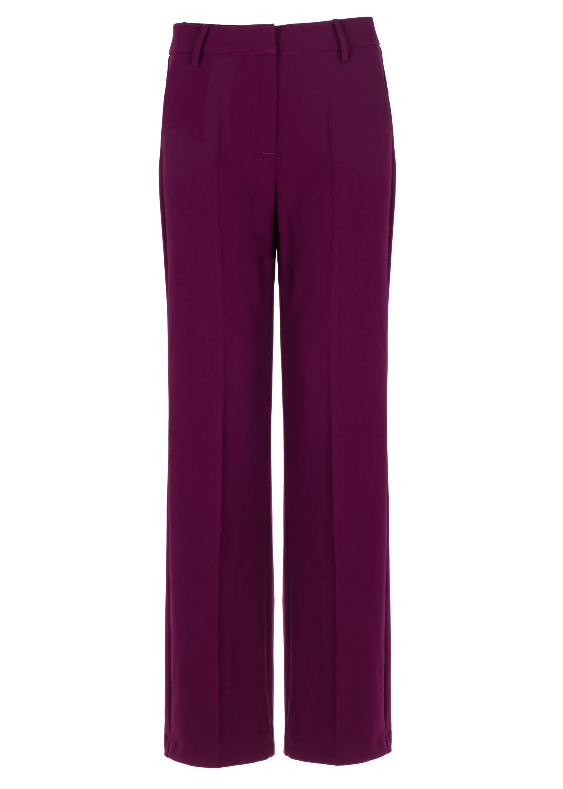 Deze elegante high-rise pantalon in de kleur Burgundy is een verfijnde toevoeging aan je garderobe. Gemaakt van een luxe polyester blend met stretch, biedt de pantalon zowel comfort als stijl. De wijde pijpen, belt loops en insteekzakken zorgen voor een moderne en veelzijdige look.