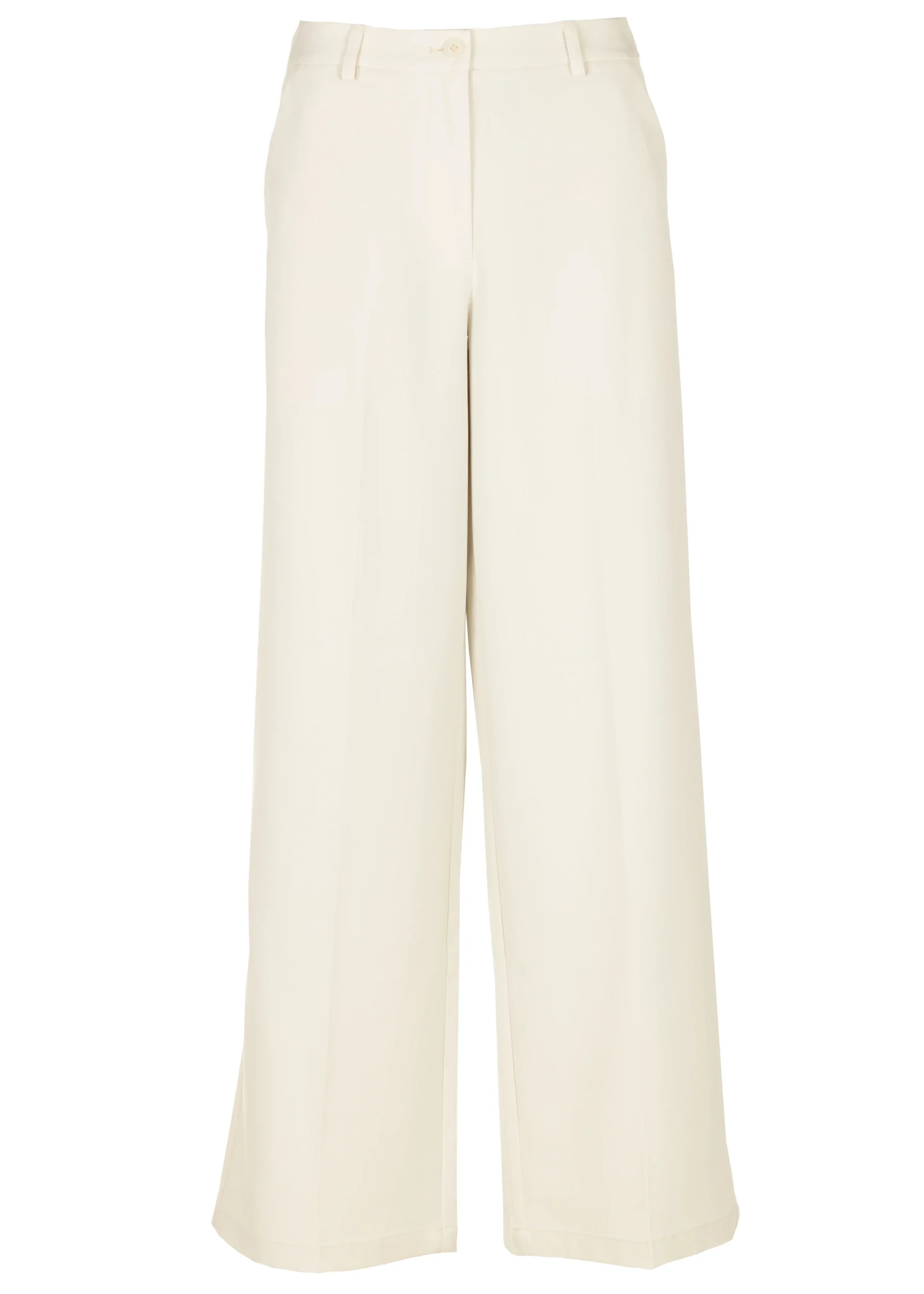This elegant wide-leg trousers are crafted from a luxurious twill structure with mélange yarn, giving them a refined look. The button closure and elastic detail in the waistband provide both style and comfort. Perfect for both formal and casual outfits.