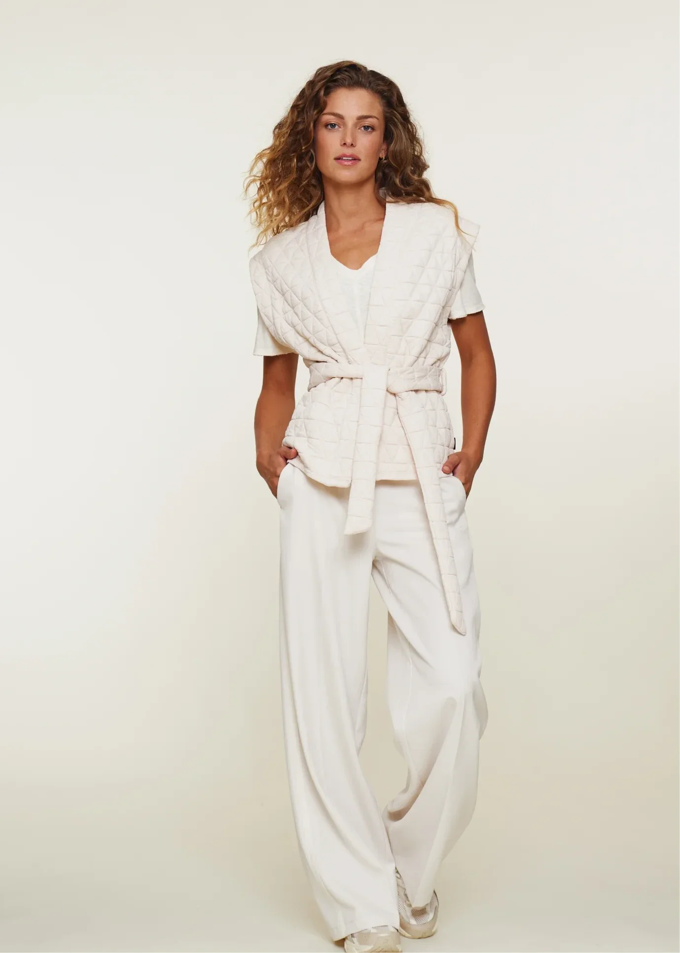 Dit elegante gilet is gemaakt van zachte jerseystof met een subtiel jacquardpatroon, wat zorgt voor een luxe look en ultiem comfort. Het mouwloze ontwerp en de tailleriem creëren een flatterend silhouet, waardoor het het perfecte stuk is om een stijlvolle en moderne touch aan je outfit toe te voegen. Draag het als een gelaagd stuk over een blouse of top voor een verfijnde look.