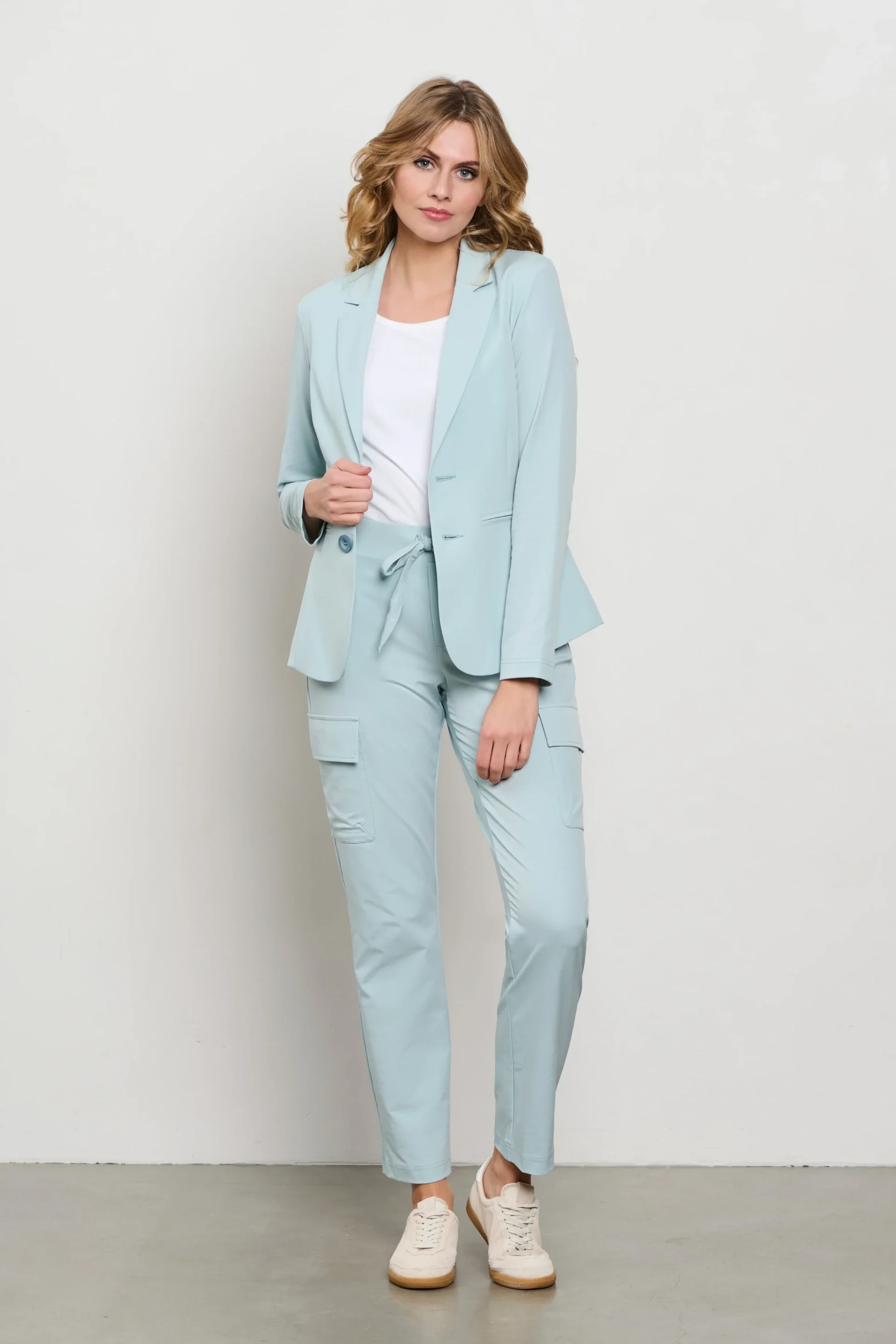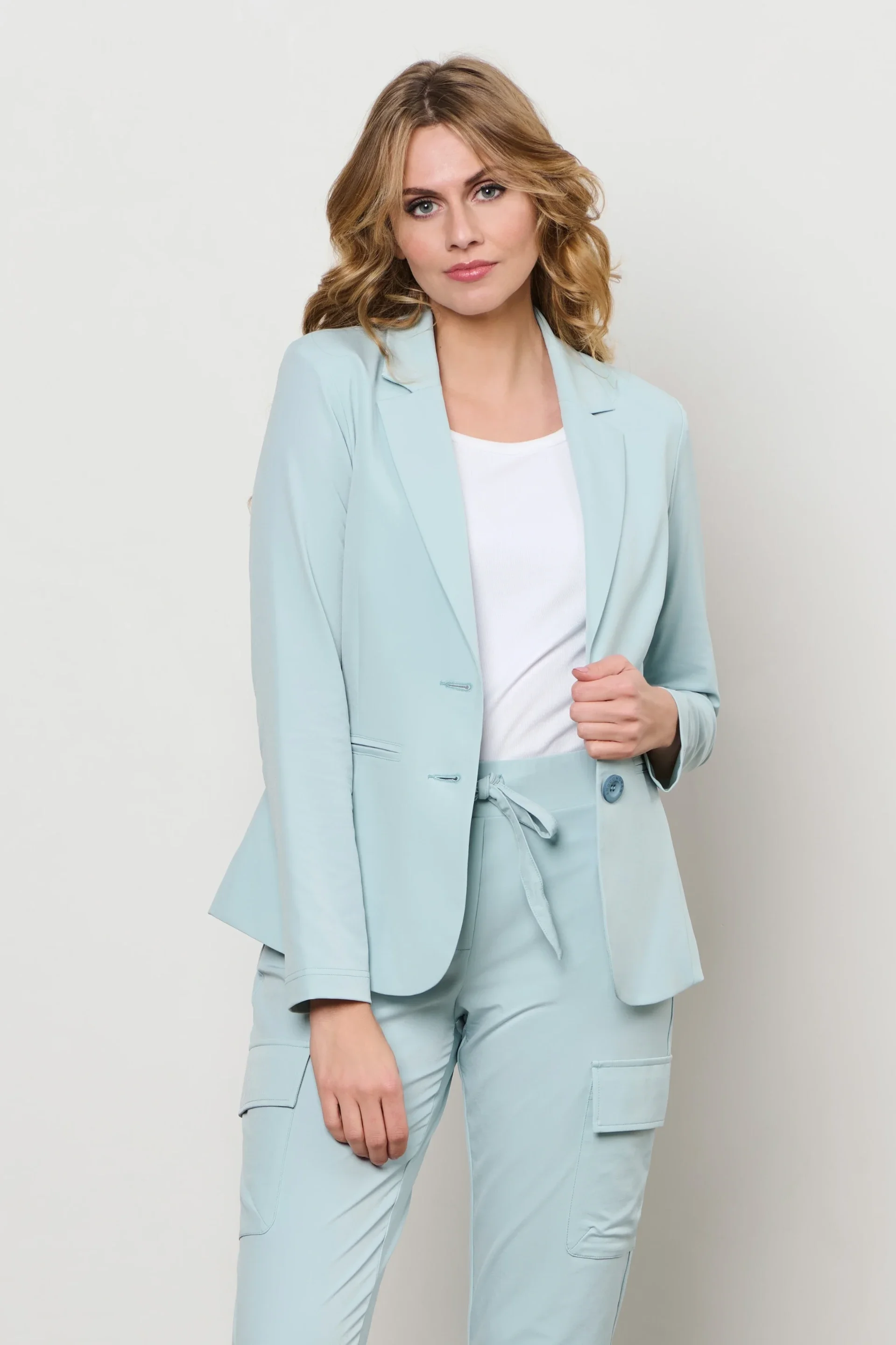 De Travel Blazer Phileine Pastel Turquoise van &Co woman is een elegante blazer met een aangesloten pasvorm, klepzakken en een soepele stretchstof. Ideaal voor een frisse, vrouwelijke en comfortabele outfit.