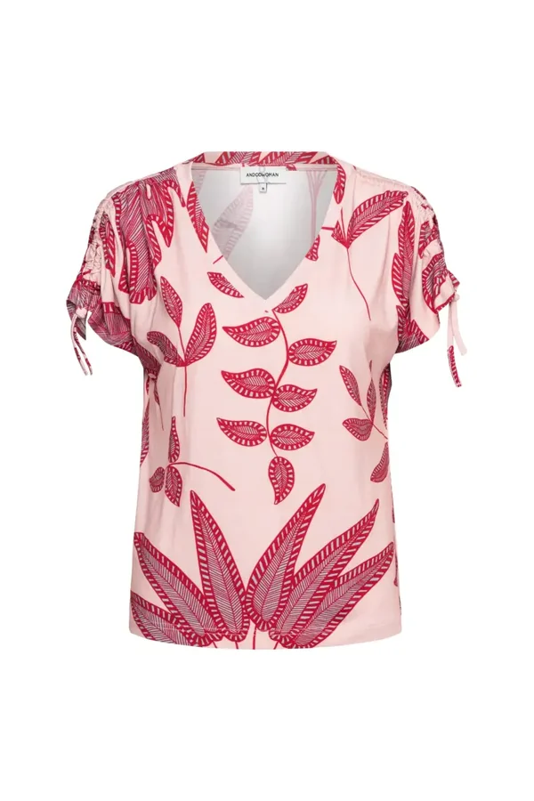 De Top Viana Garden Soft Pink Multi van &Co Woman straalt zomer uit. De roze basis met opvallende rode bladeren, V-hals en strikdetails op de schouders zorgen voor een frisse, vrouwelijke look met een speels accent.