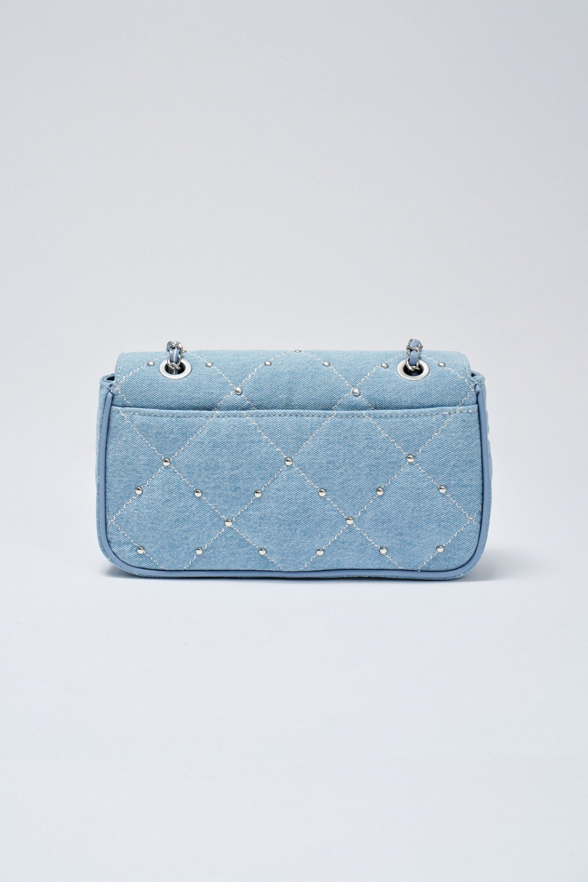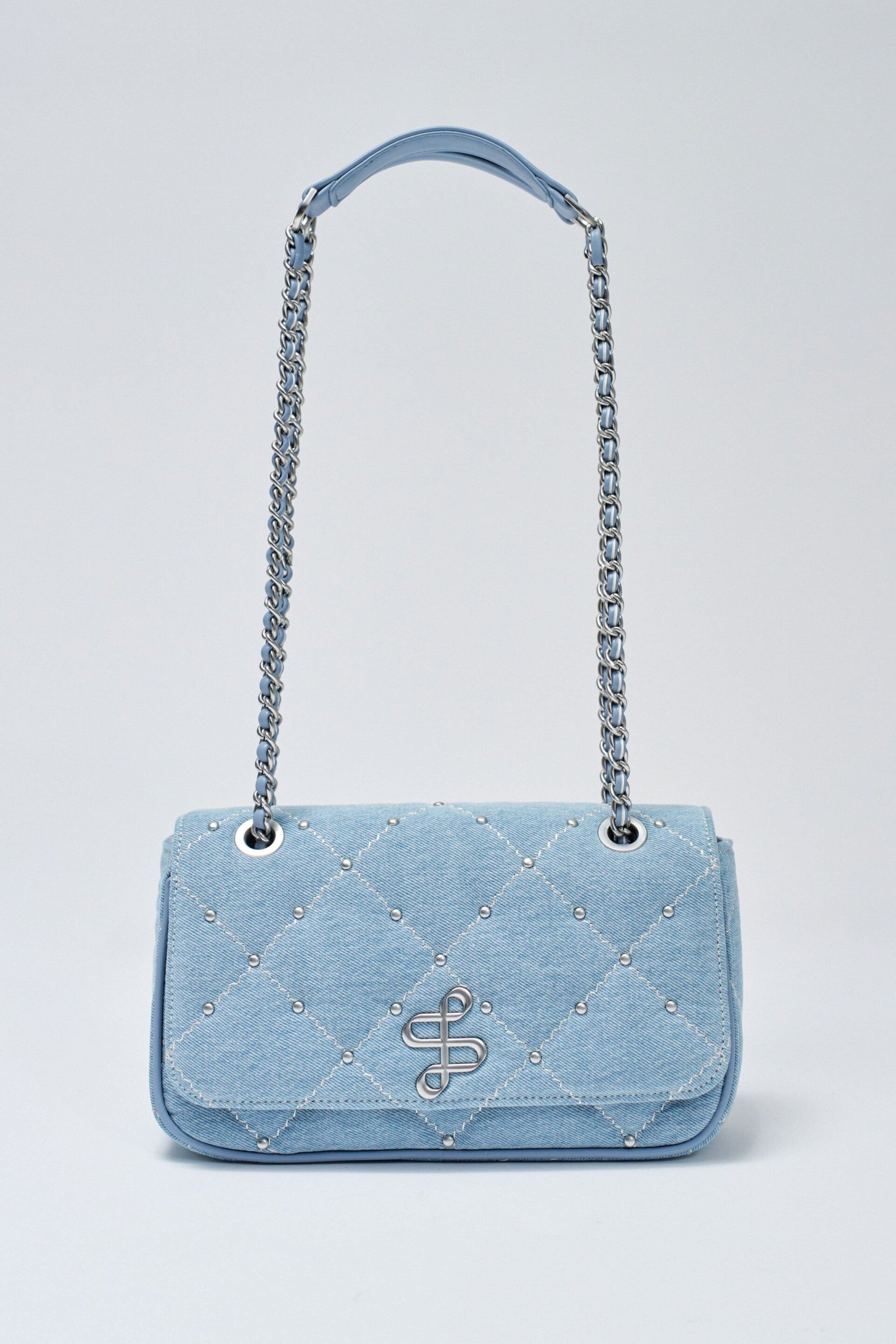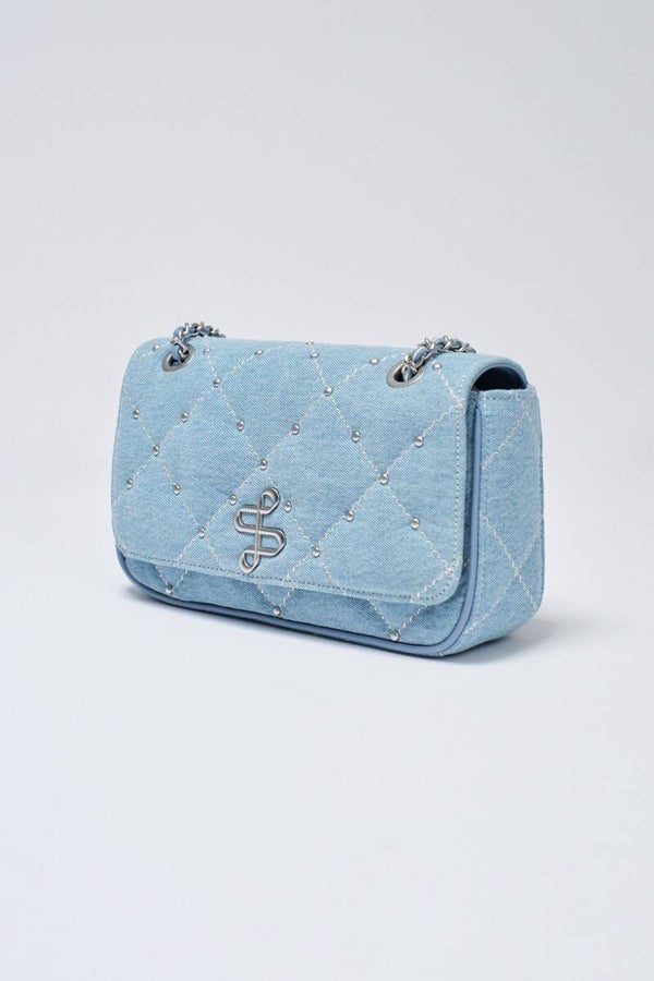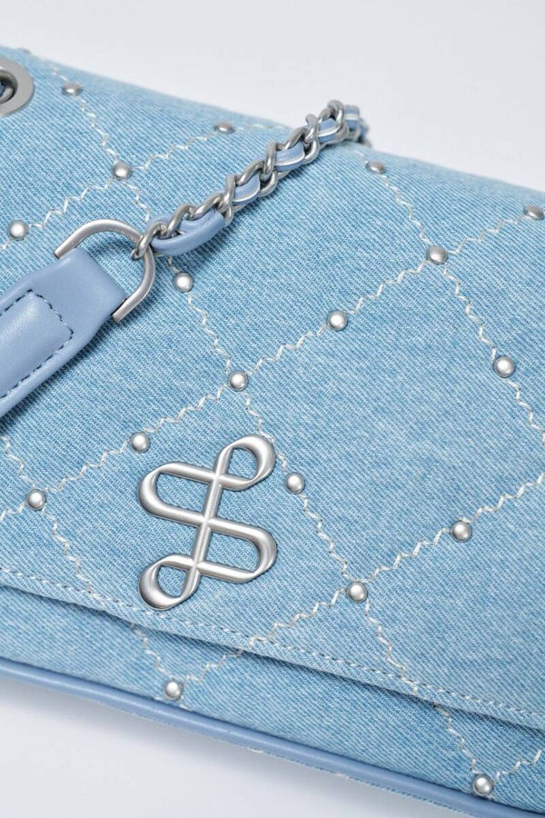 - Denim bag with shiny appliques- Blue colour- Snap button closure- Branding detail- Interior compartments- Adjustable chain strap- Height x Width x Depth 14.5 x 25 x 6 cm.