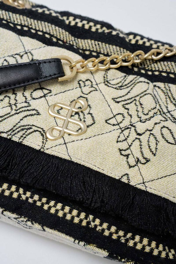 - Bag with jacquard embroidery - Black and beige colour - Snap button opening - Branding detail - Fringes on the edges - Interior compartments - Adjustable chain strap - Height x Width 20 x 30