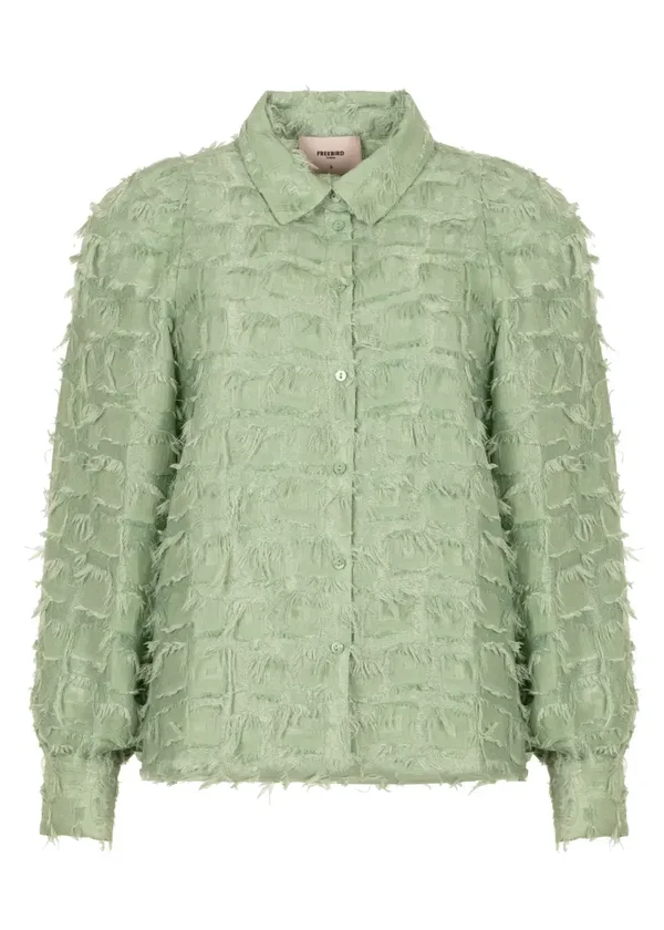 Voeg een speelse textuur toe aan je garderobe met deze elegante blouse, vervaardigd uit een zachte stof met een verenachtig effect. Ontworpen met volumineuze ballonmouwen en een verfijnde knoopsluiting aan de voorzijde, combineert deze blouse moeiteloos vrouwelijke charme met draagcomfort. De subtiele glans en lichte structuur maken dit item perfect voor zowel overdag als ’s avonds.