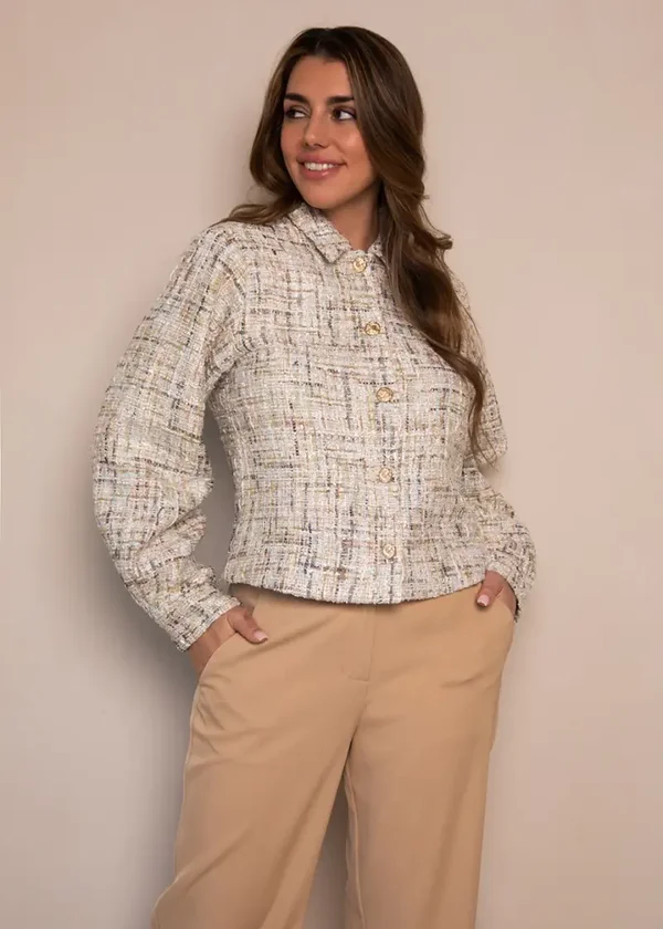 Gemaakt van een zachte bouclé stof met glinsterende accenten en een verfijnde mix van kleuren, straalt dit jasje klasse én speelsheid uit. De rijke textuur zorgt voor een modieuze look, terwijl het cropped model perfect combineert met een high-waisted broek of rok. De klassieke knoopsluiting en lange mouwen maken het geheel tijdloos én veelzijdig — ideaal voor een chique daglook of een feestelijke avond.