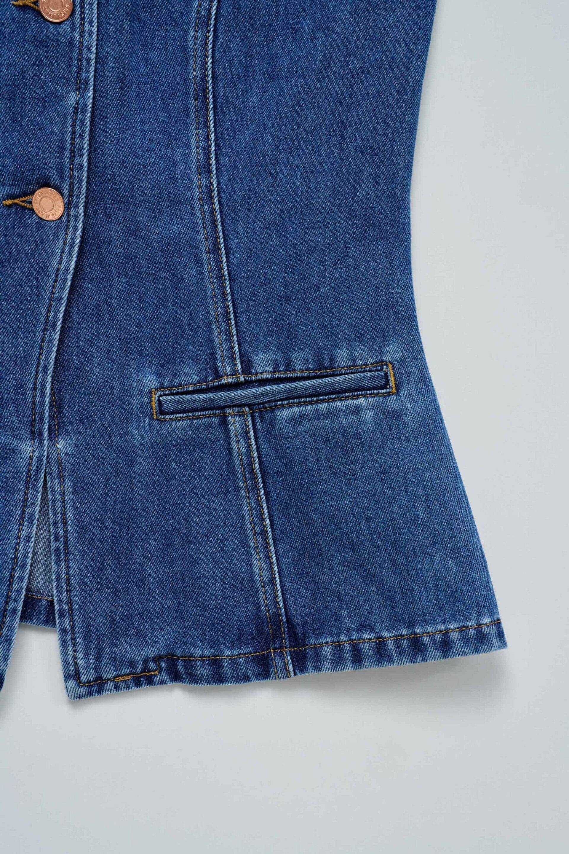 This denim waistcoat with a slim fit and round neckline is a fresh and stylish choice for sunny days. The defined seams elongate the silhouette, the two pockets add functionality, and the front button closure completes the look with a classic touch. Sleeveless and made in a lighter denim, it adapts to different moods: wear it with a top underneath for a casual look or directly over the skin for a relaxed and current look. Versatile and easy to combine, it pairs perfectly with wide denim trousers for a cool, comfortable, and ready-for-anything combination. A piece that adds attitude to your summer outfits.
