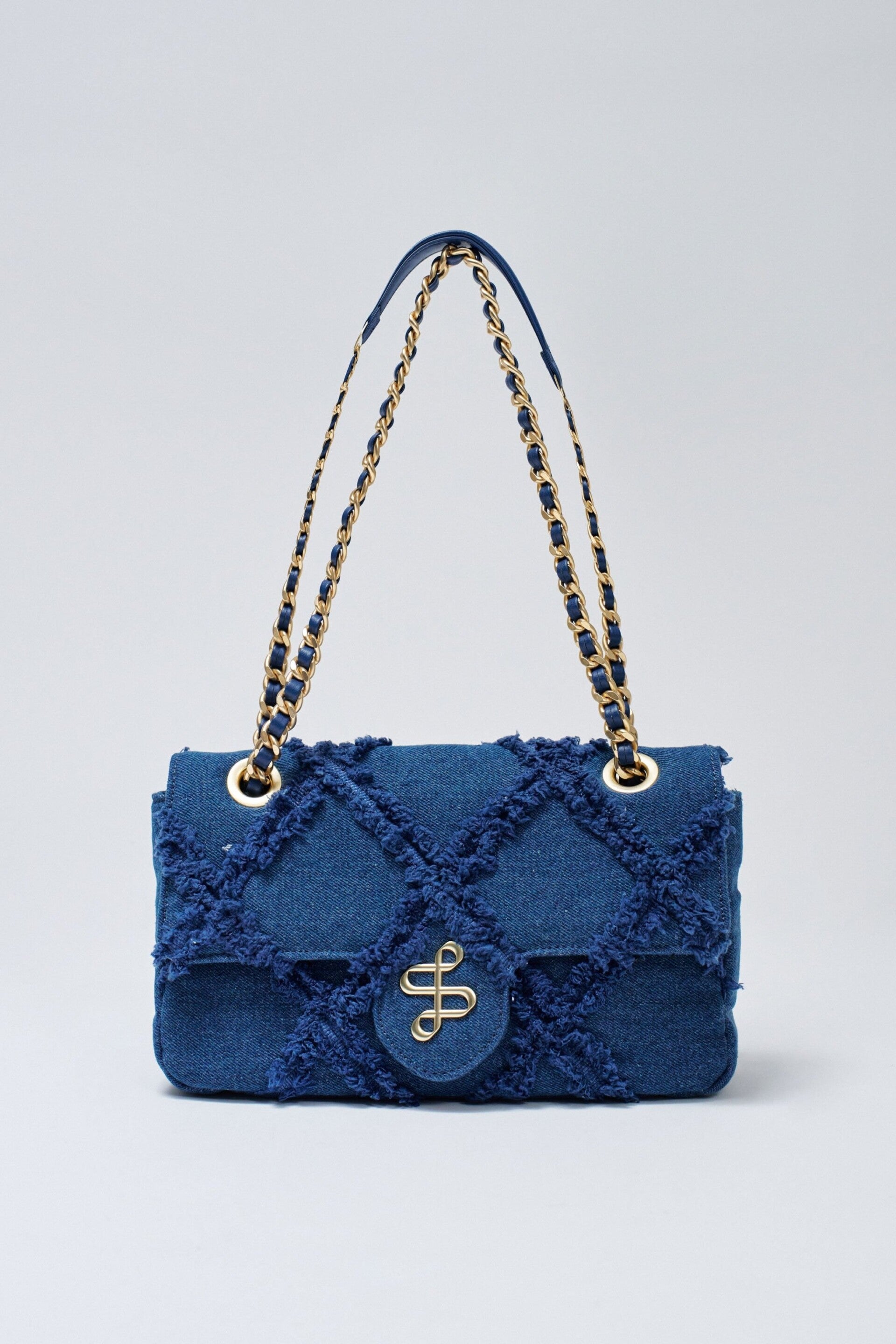 - Denim bag with frayed effect- Blue colour- Snap button closure- Branding detail- Interior compartments- Adjustable chain strap- Height x Width x Depth 17.5 x 27 x 8.50 cm.