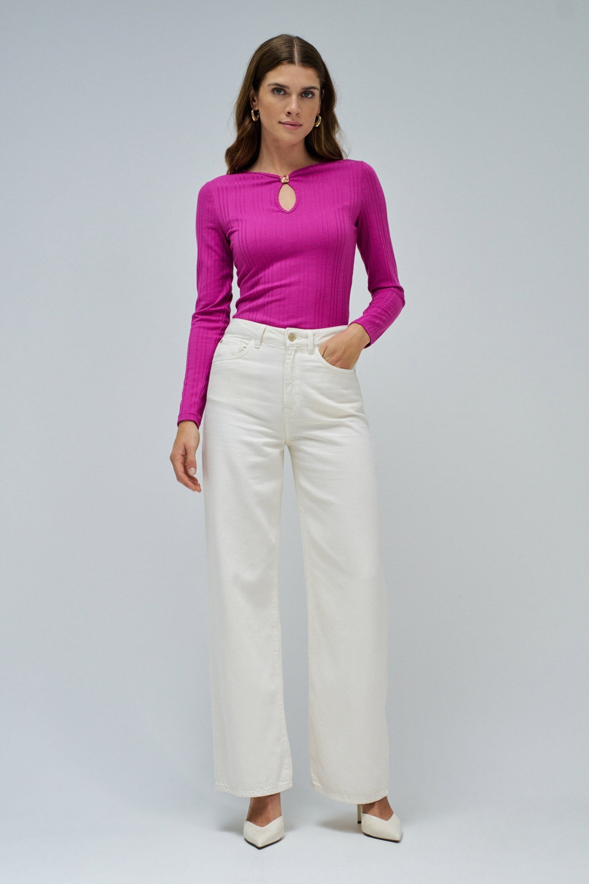 This fine ribbed knit sweater is a sophisticated essential for your wardrobe and stands out for the chest opening detail. The slim fit enhances the silhouette, ensuring a feminine and modern look. Versatile and timeless, it is perfect for any occasion.
