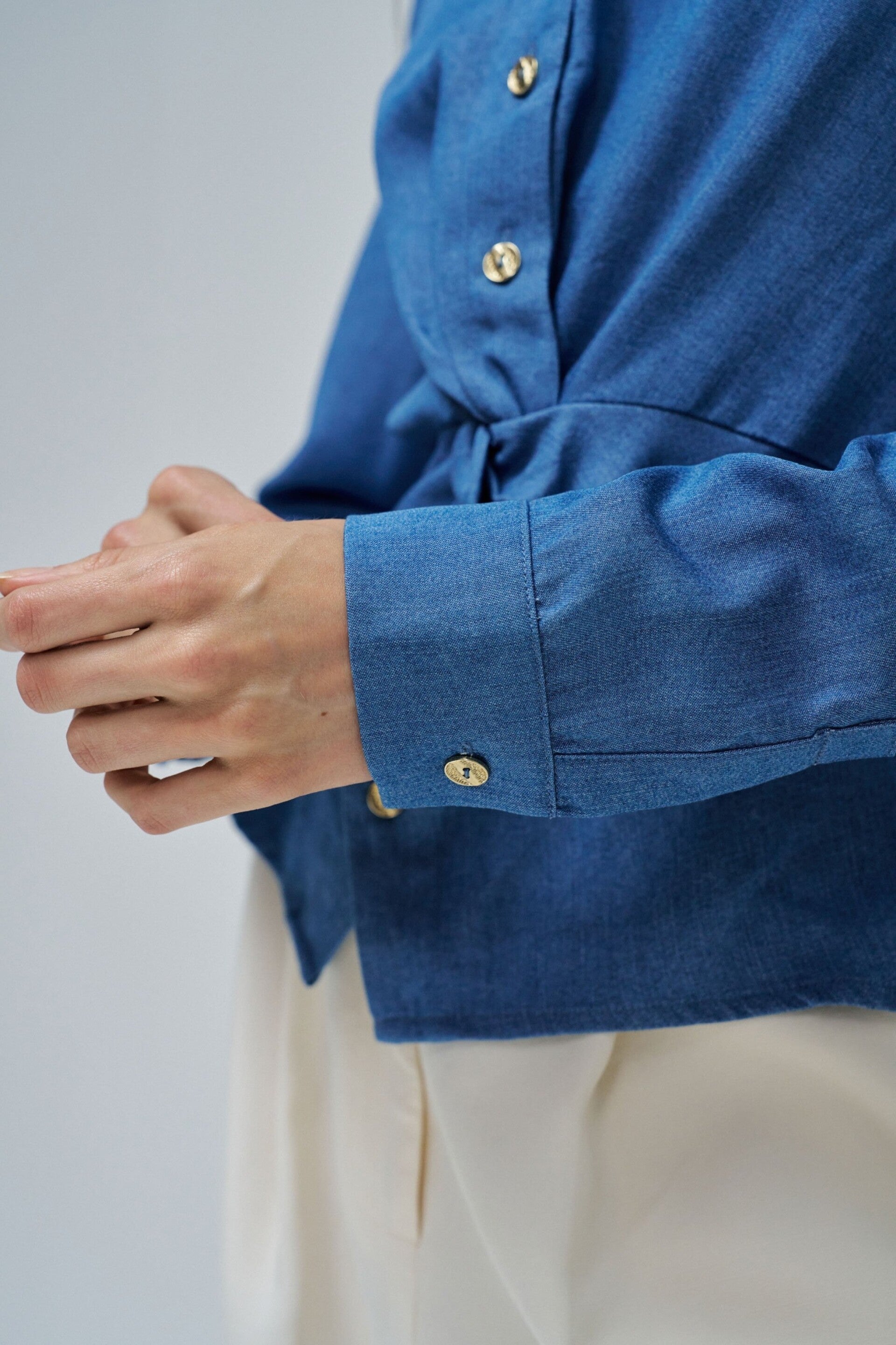 Light, feminine and full of style. This blouse in light denim blue is the perfect choice for those looking for a relaxed look, but with a touch of sophistication. The V-neck with a collar visually lengthens the silhouette and subtly enhances the neckline, while the long sleeves with buttoned cuffs add structure to the look. The golden buttons elevate the look with a hint of elegance, effortlessly elegant. The waist knot detail allows you to define the silhouette, creating a flattering effect that suits all body shapes.