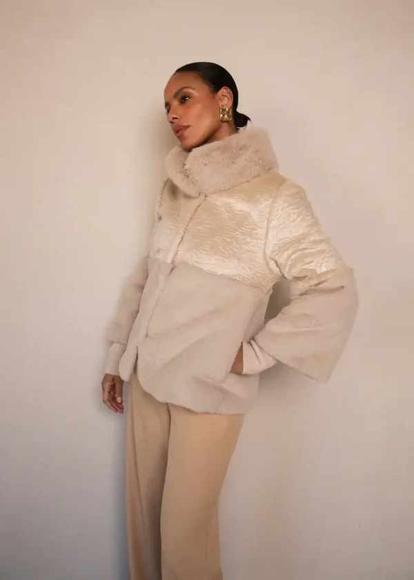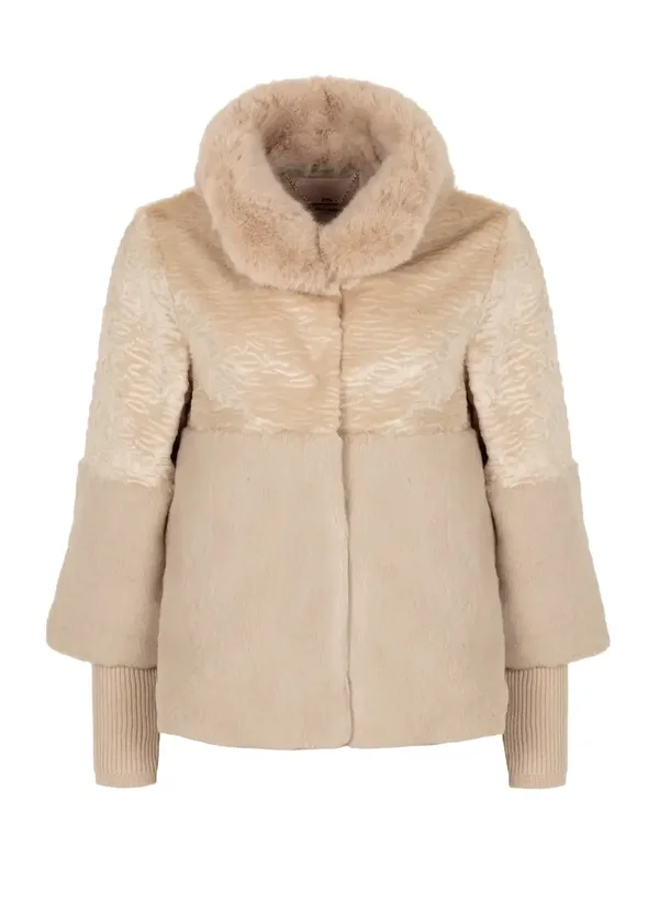 Stijlvolle korte jas met faux fur look. Gemaakt van een zachte fur kwaliteit met astrakanstructuur. De korte mouwen zijn afgewerkt met comfortabele ribboorden voor een moderne, verfijnde uitstraling.