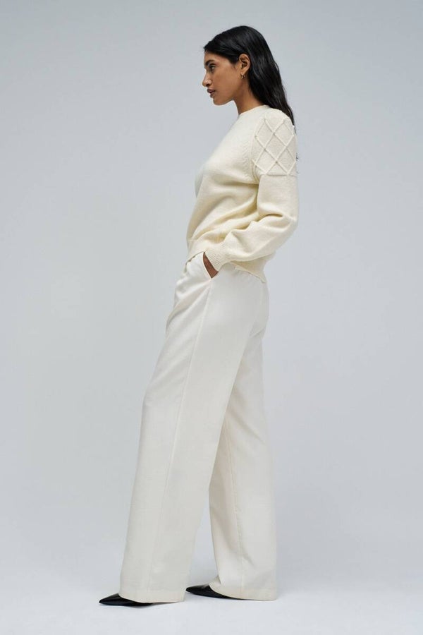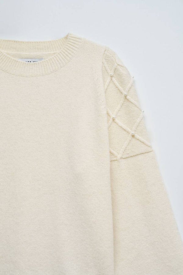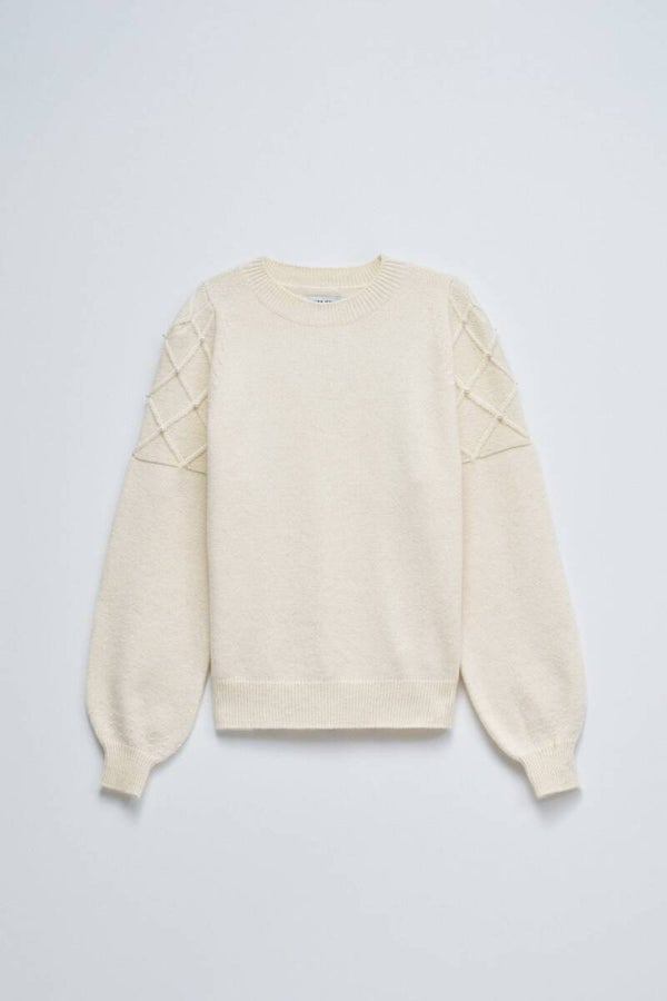 Knit sweater in off-white, marked by the elegant simplicity of the round neckline and the delicate touch of pearls applied on the sleeves. With a regular fit and ribbed finish on the cuffs and waist, it combines comfort and sophistication in equal measure, perfect for elevating everyday looks with a feminine and refined detail.