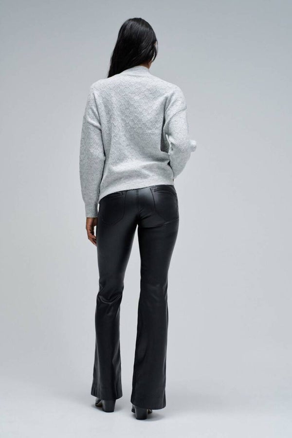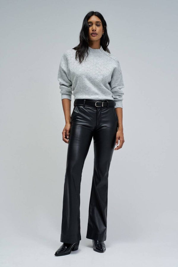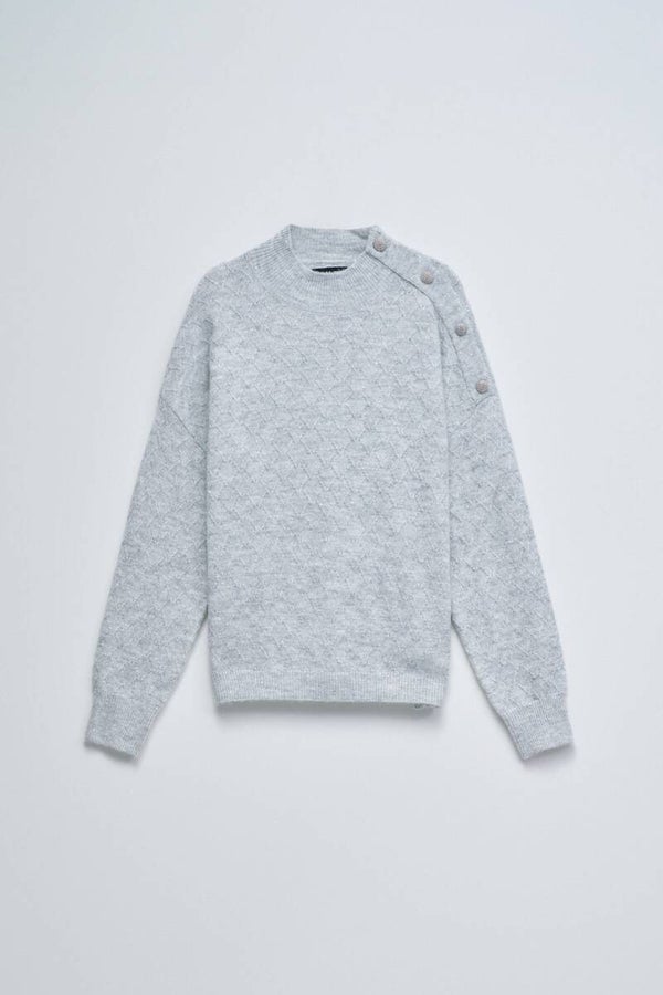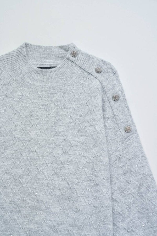 Knitted sweater in a grey tone with lurex threads, reflecting light with subtlety and elegance. The loose fit and half collar give a relaxed and comfortable touch, while the button detail on the shoulder adds a distinct and feminine element. A versatile piece, perfect for adding shine to everyday looks.