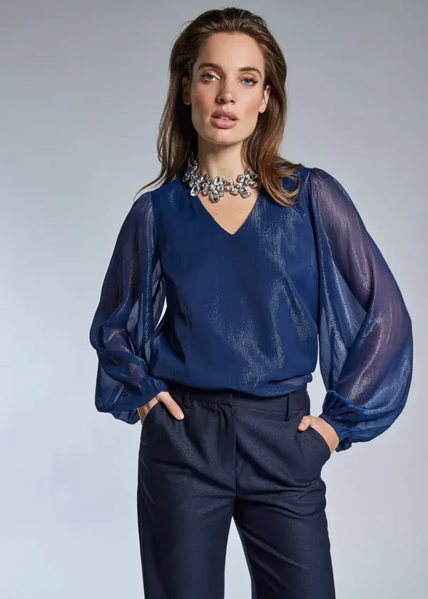 De blouse is gemaakt van een luchtige woven kwaliteit met subtiele zilverkleurige lurexstrepen die bij elke beweging een verfijnde glans geven. De diepe V-hals zorgt voor een vrouwelijke uitstraling, terwijl de ballonmouwen met elastische manchetten het ontwerp een speelse en stijlvolle twist geven. Perfect te combineren met zowel een jeans voor een casual look als een rok of pantalon voor een feestelijke avond.
