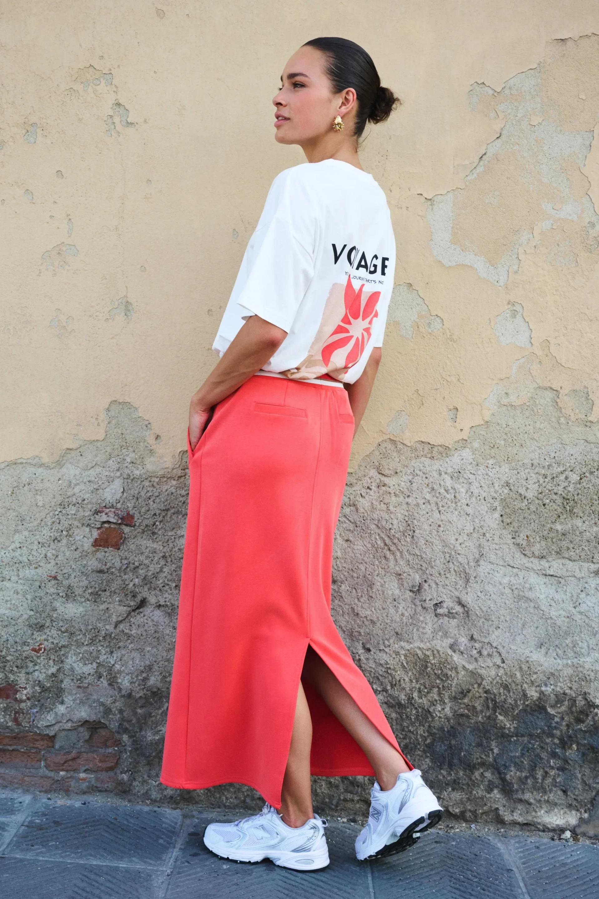 - Het ecom model is 173 cm, het campagne model is 175 cm, beiden dragen maat S
