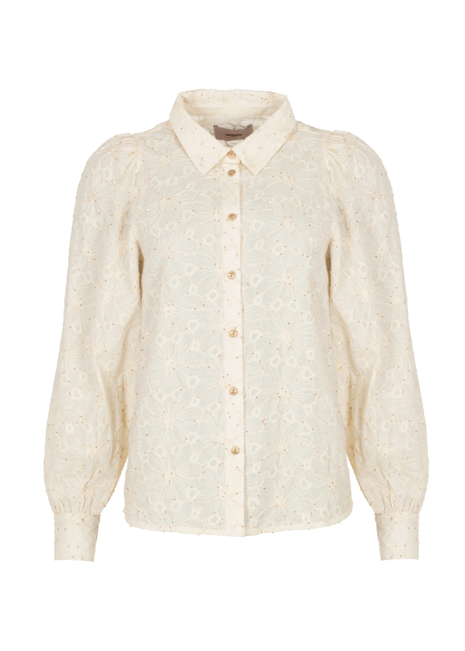 Voeg een vleugje verfijning toe aan je garderobe met deze prachtige blouse in een luchtige woven katoenen kwaliteit. Het ontwerp is rijkelijk voorzien van broderie details en subtiele kleine pailletjes, die een elegante glans creëren bij elke beweging.De vrouwelijke pasvorm en de zachte off-white kleur maken deze blouse ideaal voor zowel casual looks als feestelijke gelegenheden. Een tijdloos item dat moeiteloos charme en stijl combineert.