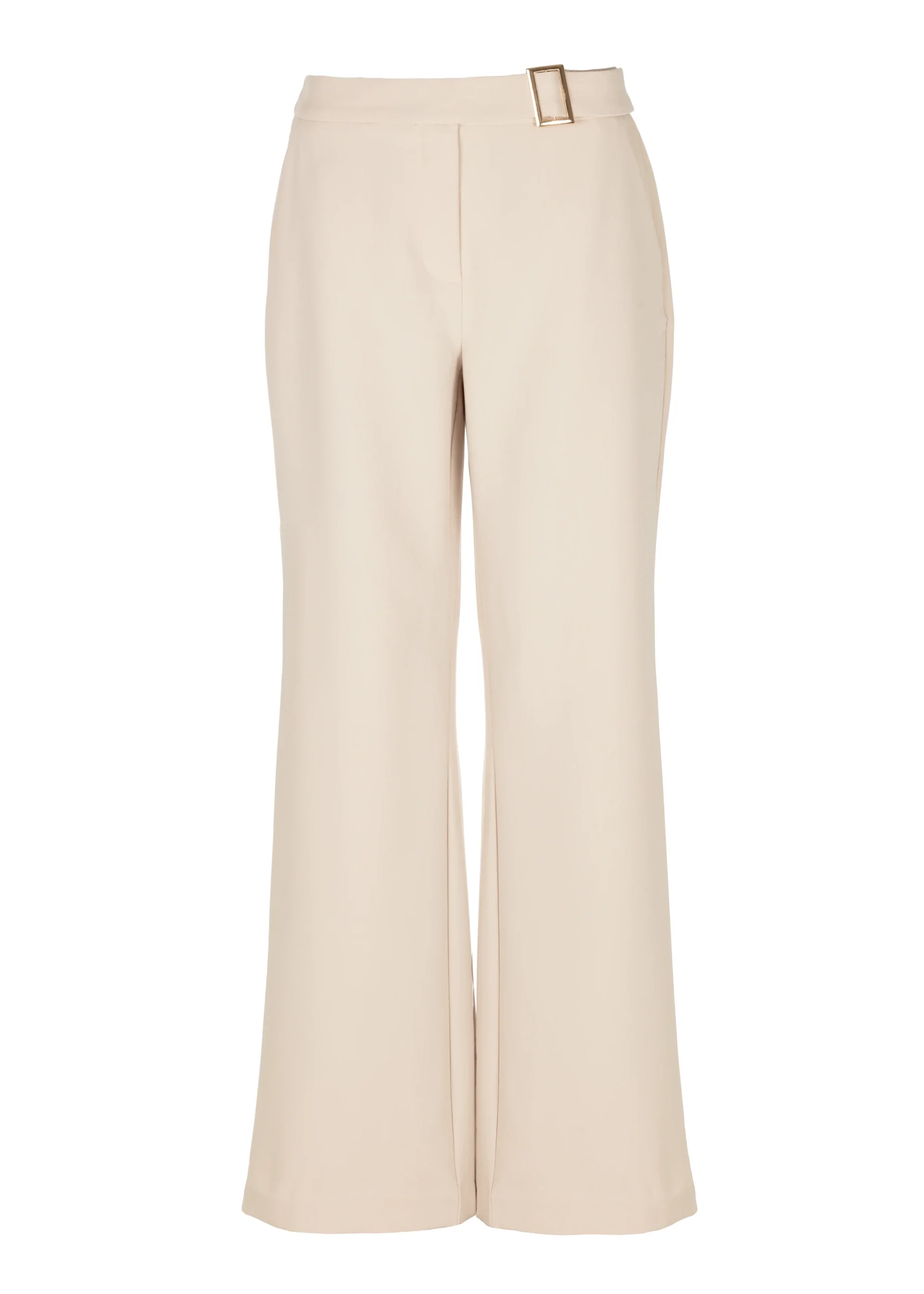 Deze broek is uitgevoerd in een comfortabele viscosemix met lichte stretch, wat zorgt voor een soepele valling en een prettig draagcomfort. Het ontwerp heeft een hoge taille en rechte, wijde pijpen voor een elegant en flatterend silhouet. De subtiele gespdetail in de taille voegt een verfijnde en moderne touch toe, waardoor deze broek zowel geschikt is voor een geklede look als voor dagelijks gebruik.