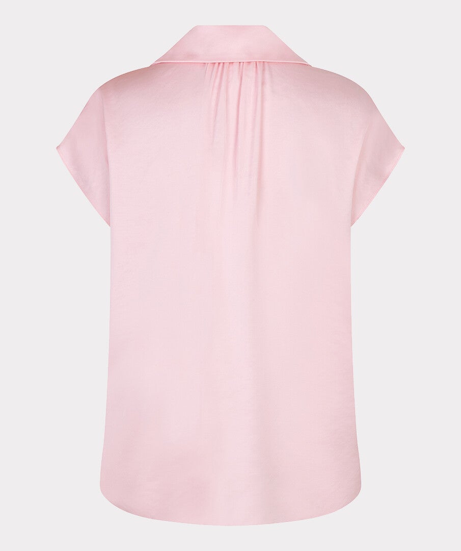 Licht glanzende blouse met reverskraag, parelmoer knopen en kapmouwtjes.