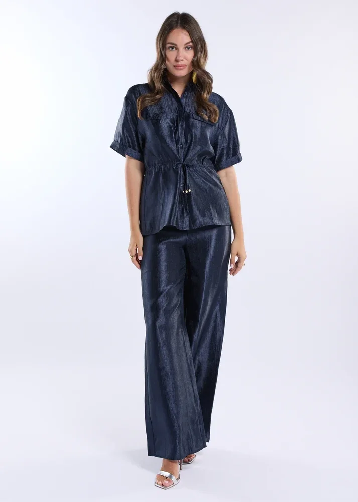 Deze pantalon is uitgevoerd in een soepel geweven kwaliteit met een elegante glans. De wijde pijpen zorgen voor een vloeiende, vrouwelijke uitstraling, terwijl de elastische tailleband aan de achterzijde extra comfort en een prettige pasvorm biedt. Een stijlvol item dat moeiteloos comfort en elegantie combineert.