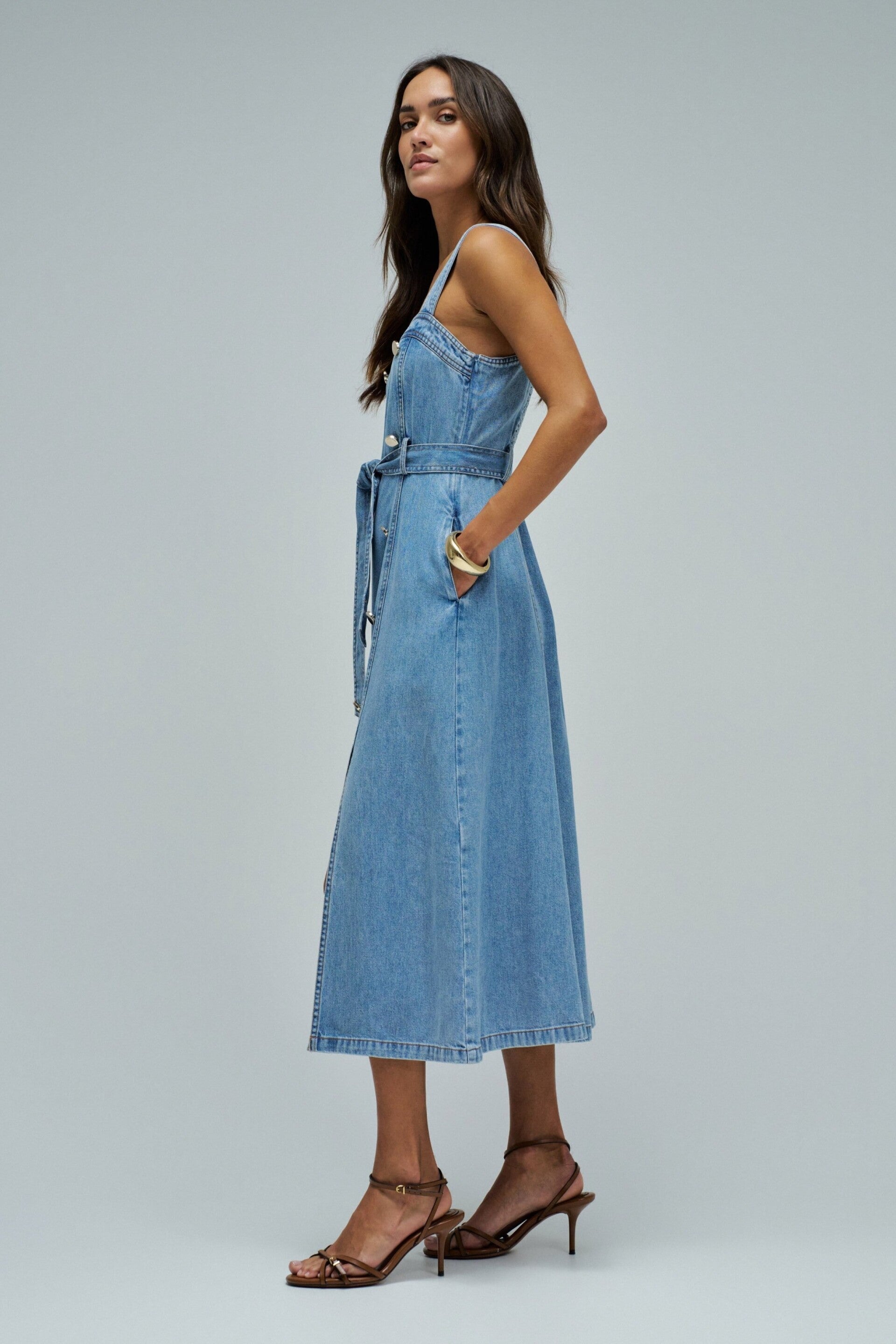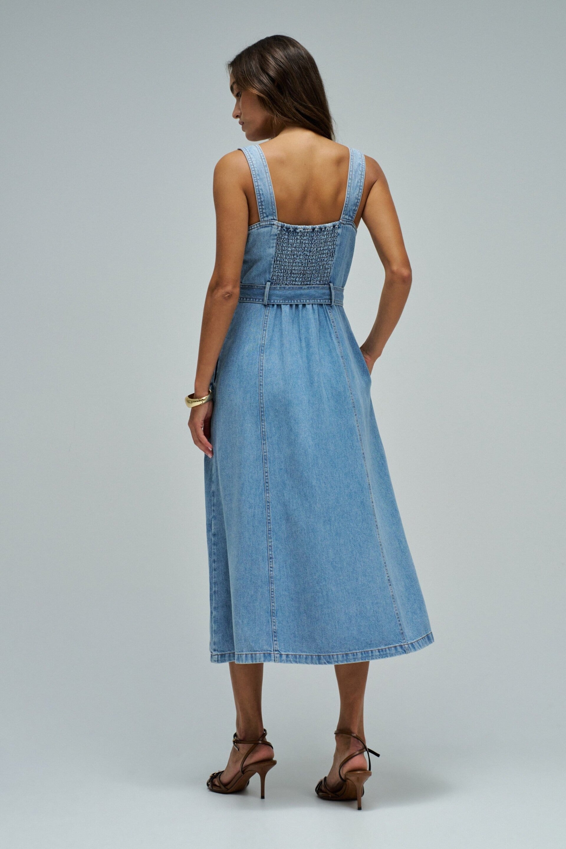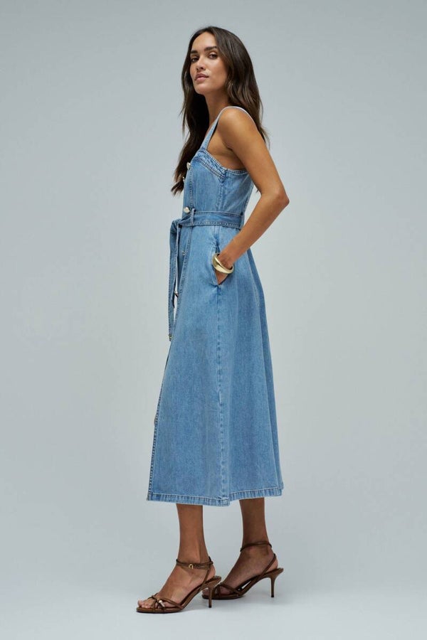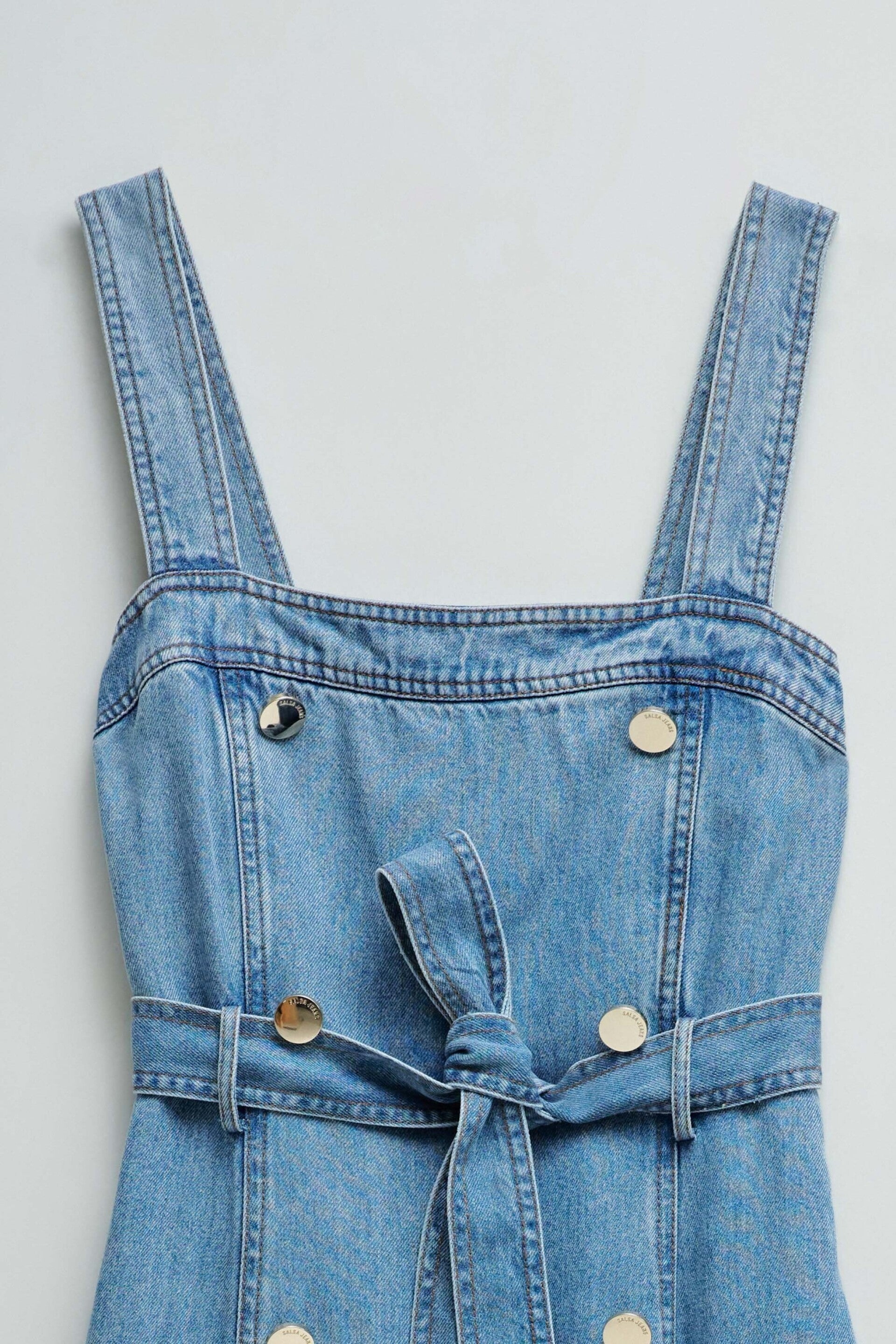 Fresh and beautiful. This light denim midi dress will secure a place in your wardrobe. The square neckline is contemporary, and the wide straps provide support and comfort. With an A-line cut and front slit, it allows for movement and invites you to dance. The waist is fitted with a belt to enhance the elegance of your silhouette. Details like buttons give it personality, and the side pockets make it practical and functional. It is light and delicate for everyday wear, versatile and elegant for a dinner. You have everything in one piece. What more do you need?